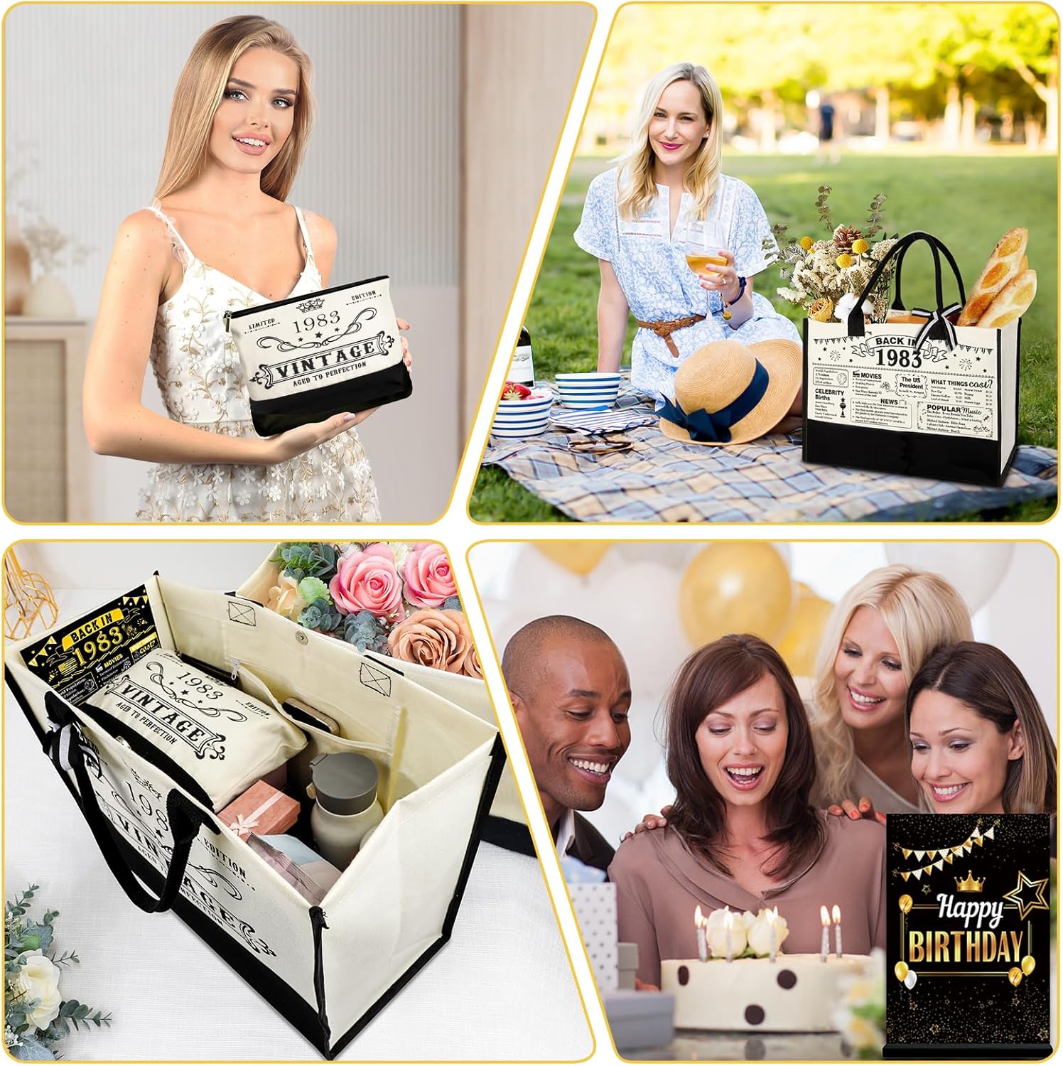 YeohJoy 42nd Birthday Gifts for Her Canvas Tote Bag Travel Gear, Unique 42 Years Old Birthday Gifts for Girlfriend Sister Friends Women, Vintage 1983 Handbag & Cosmetic Bag & Back in 1983 Poster