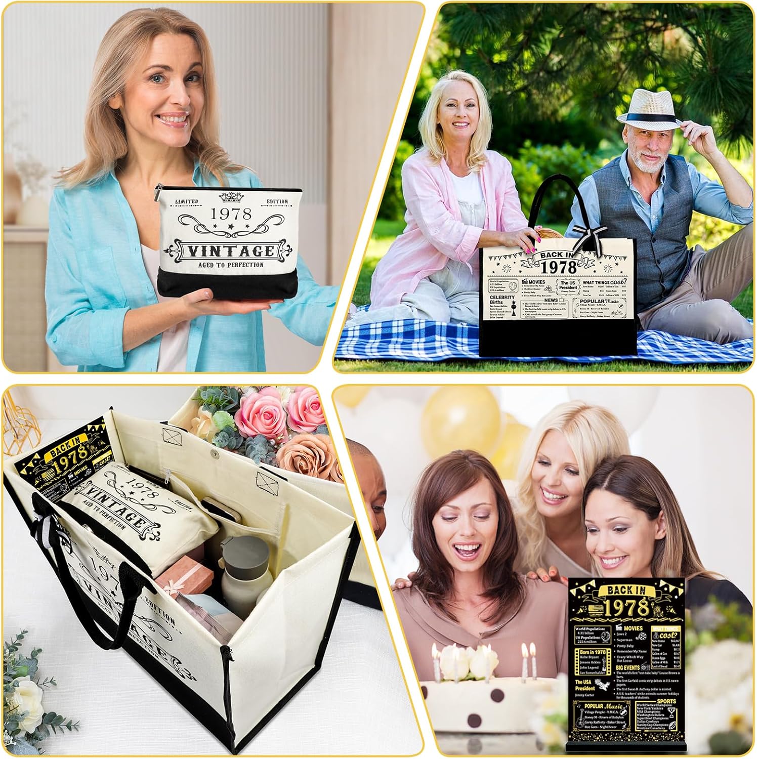 YeohJoy 47th Birthday Gifts for Her Canvas Tote Bag Travel Gear, Unique 47 Years Old Birthday Gifts for Girlfriend Sister Friends Women, Vintage 1978 Handbag & Cosmetic Bag & Back in 1978 Poster
