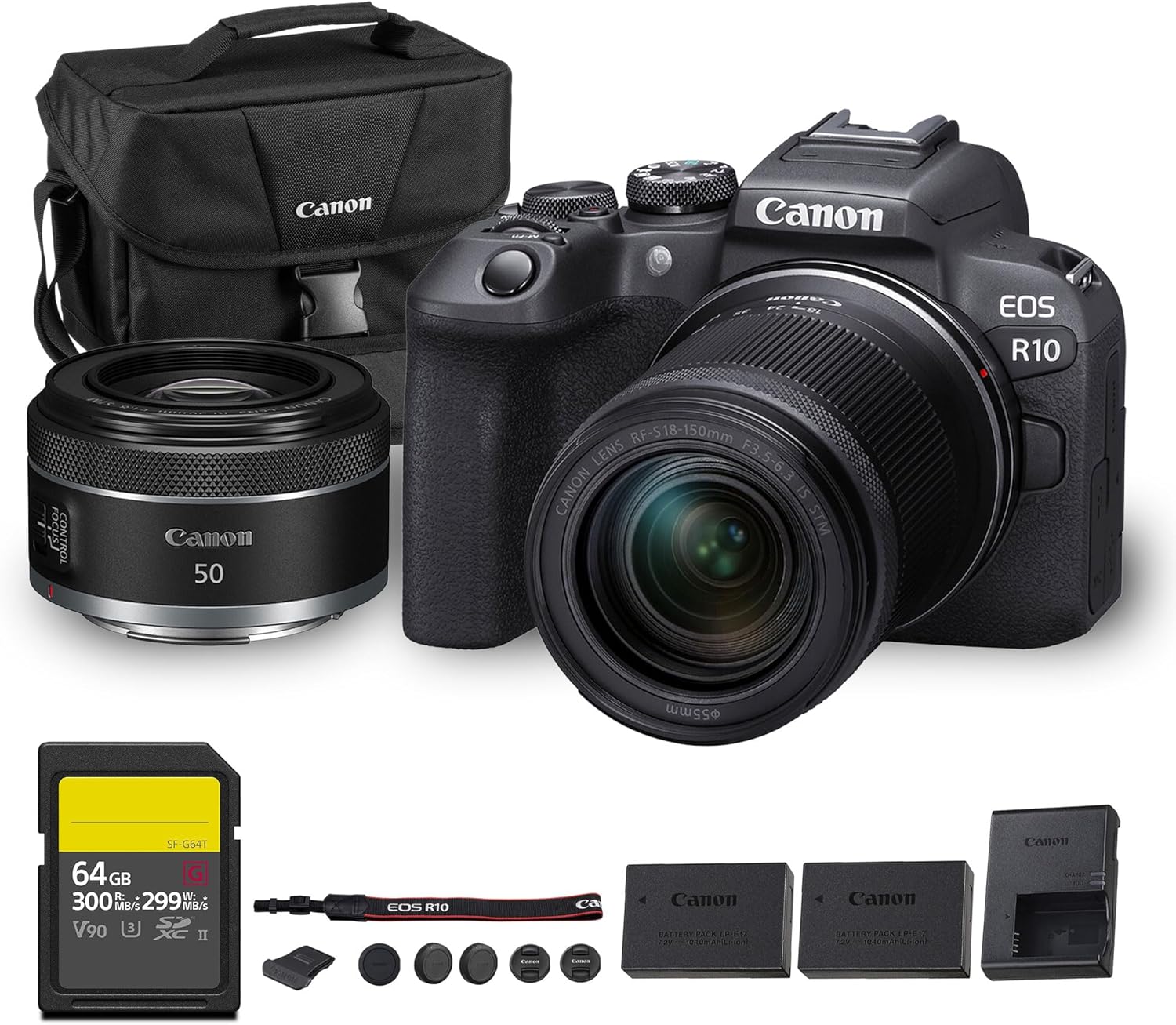 • Canon USA Authorized. Items Include: Canon EOS R10 Mirrorless Camera Kit | 24.2MP APS-C Sensor with RF-S 18-150mm Lens, Canon RF 50mm f/1.8 STM Lens, 64GB SF-G TOUGH Series UHS-II SDXC Memory Card, Canon LP-E17 Lithium-Ion Battery Pack, Canon EOS 200ES Shoulder Bag