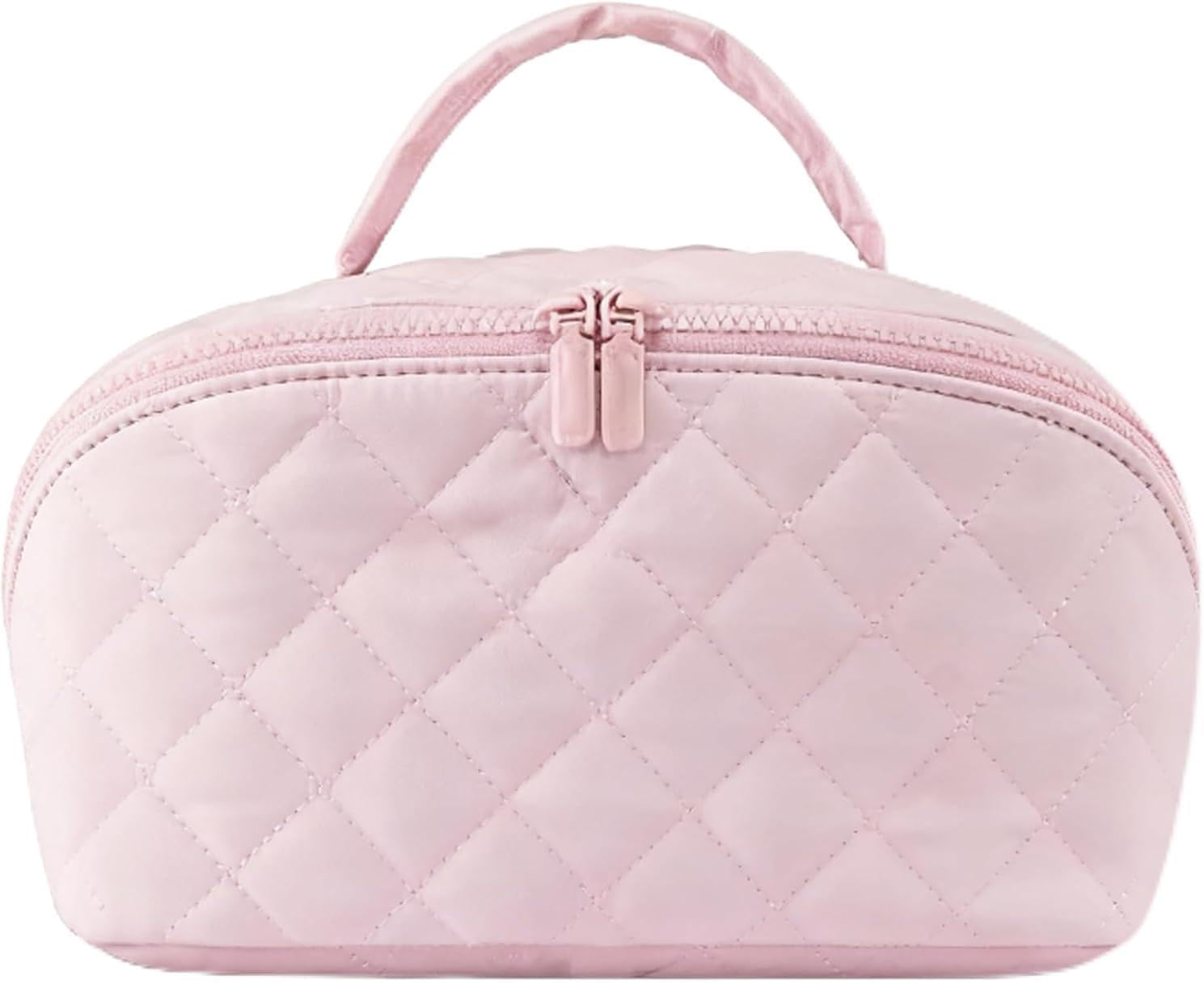 Petition Travel Makeup Bag for Woman,Festivalment Lay Flat Makeup Bag, Wide Open Water-Resistant Cosmetic Case,Puffy Padded Organizer for Toiletries & Brushes Large Capacity with Compartments (pink)