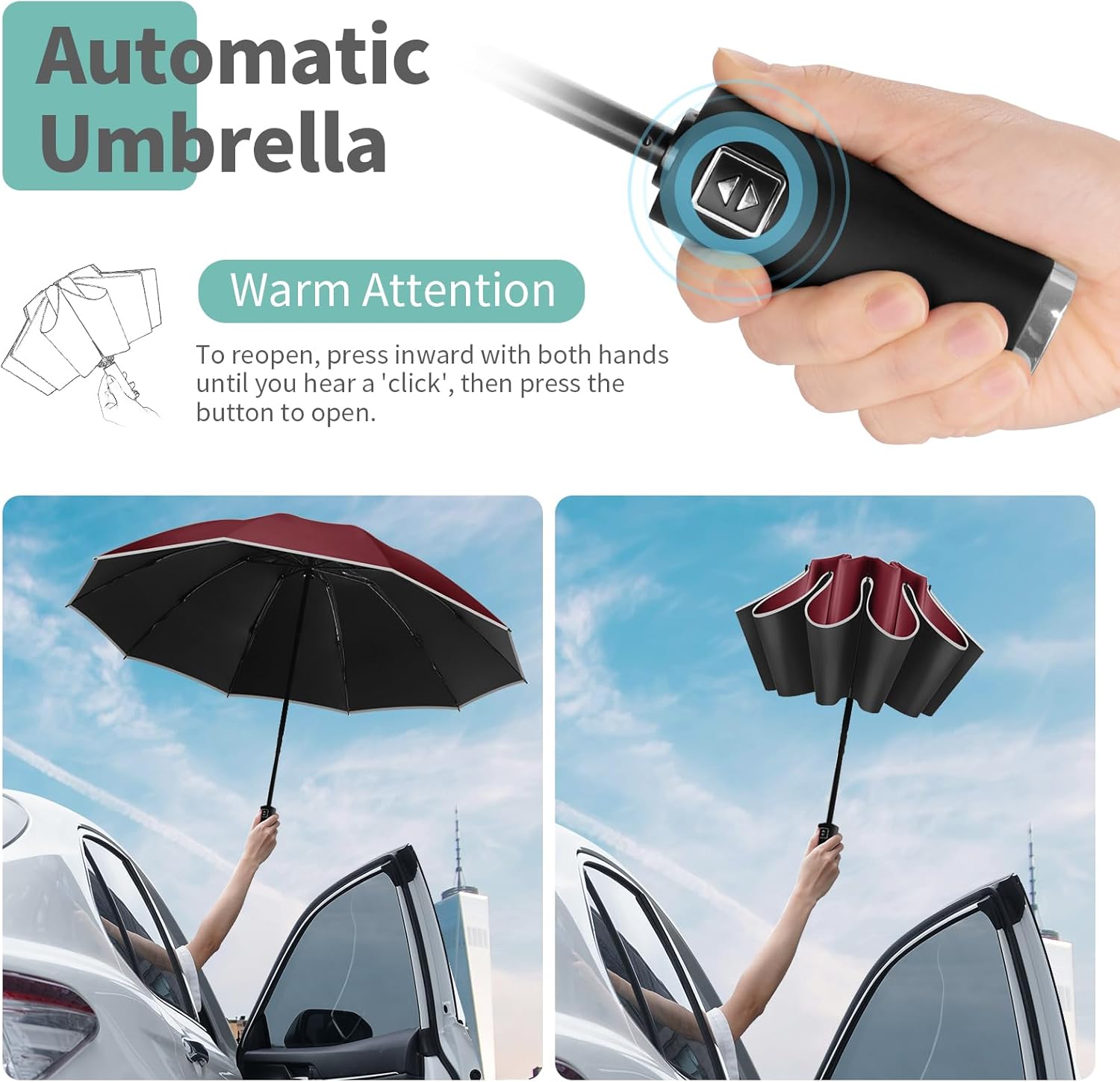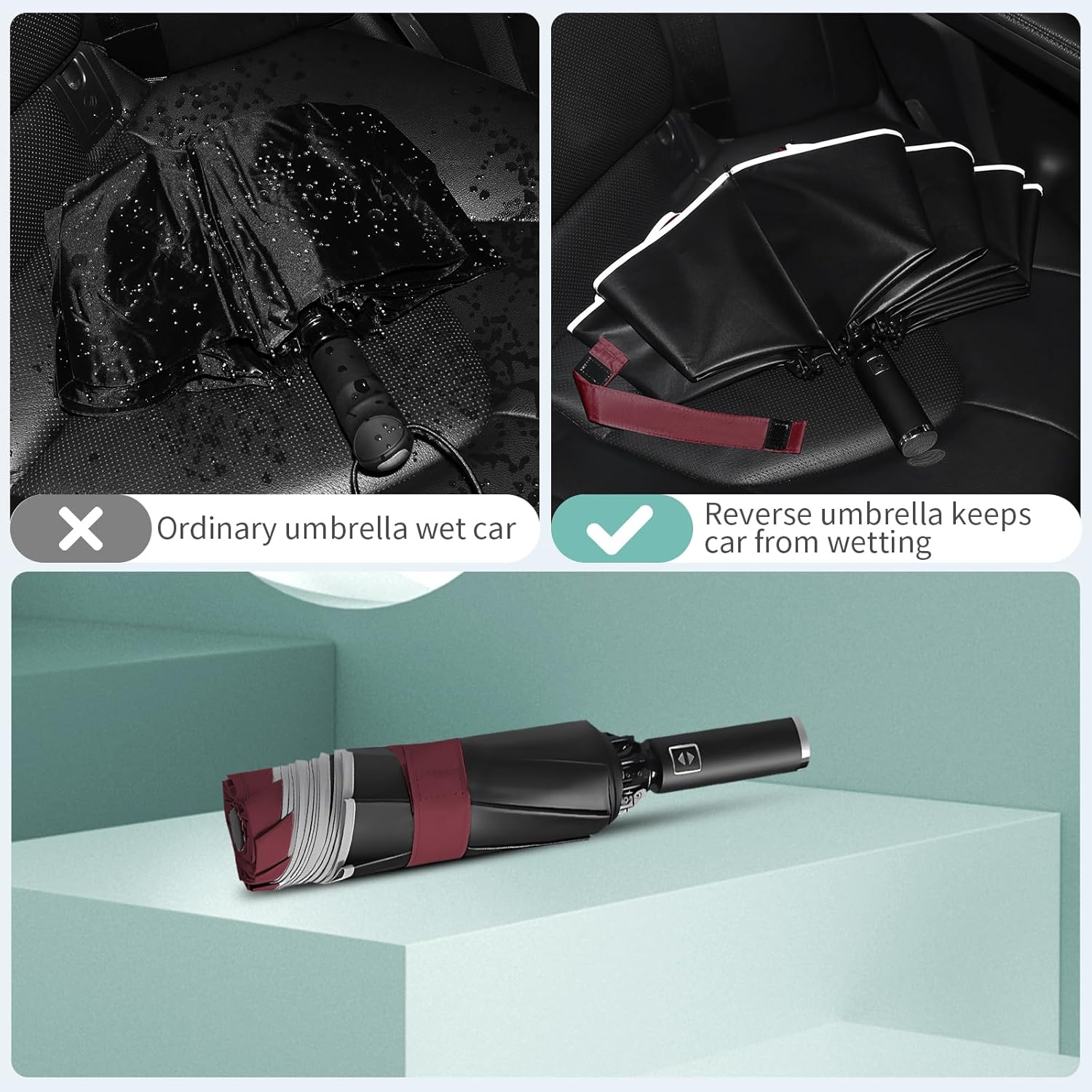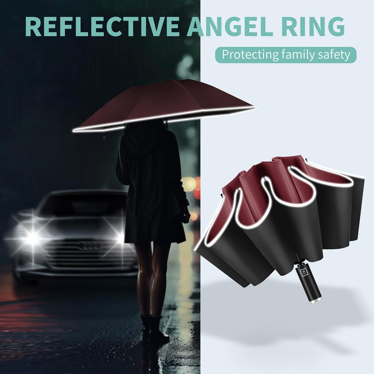 • Elevated Inverted Umbrella: Redefine your rainy day experience with Yoobure folding umbrella! Its unique inverted design allows the wet canopy to fold inside, with no splashes or drips, keeping you and the floor dry and mess-free! Plus, for added security, the travel umbrella compact features a reflective edge to enhance visibility, alerting the passing vehicles on gloomy days.
